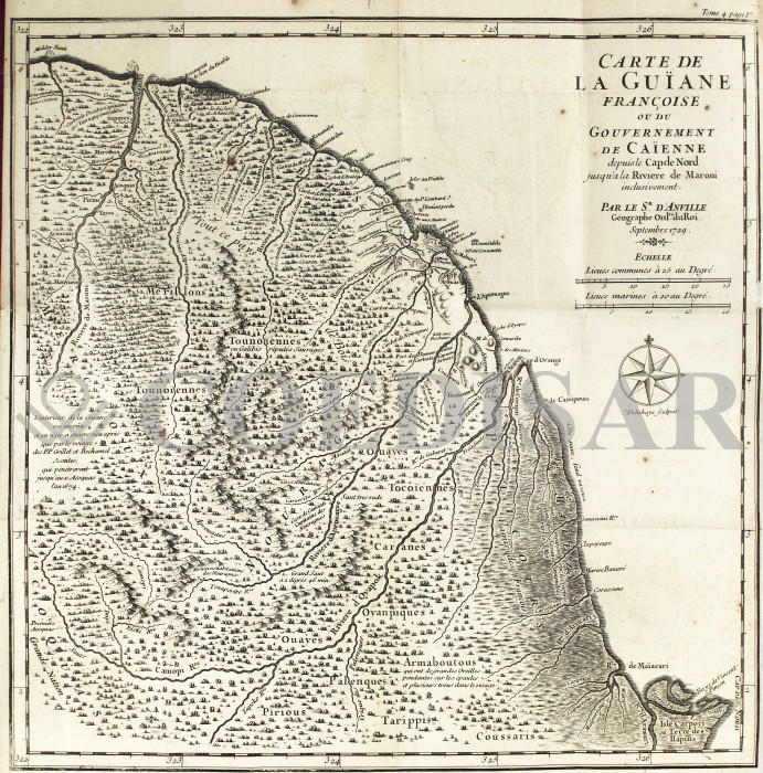 Titolo completo "Carte de la Guïane françoise ou du gouvernement de Caïenne depuis le Cap de Nord jusqu'àla rivière de Maroni inclusivement / par le Sr d'Anville géographe ord.re du Roi". La mappa, che misura cm 40 x 49, rappresenta la Guyana francese, tra i fiumi Marowijne e Oyapock con alcuni del nord del Brasile. Sono presenti elementi cartografici che includono scale, gradi di latitudine e longitudine, la rosa dei venti, dettagli topografici, nomi di fiumi, insediamenti,isole e le posizioni delle tribù native americane con il commento su alcuni di esse.